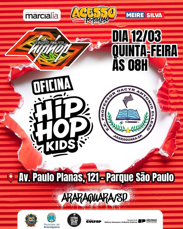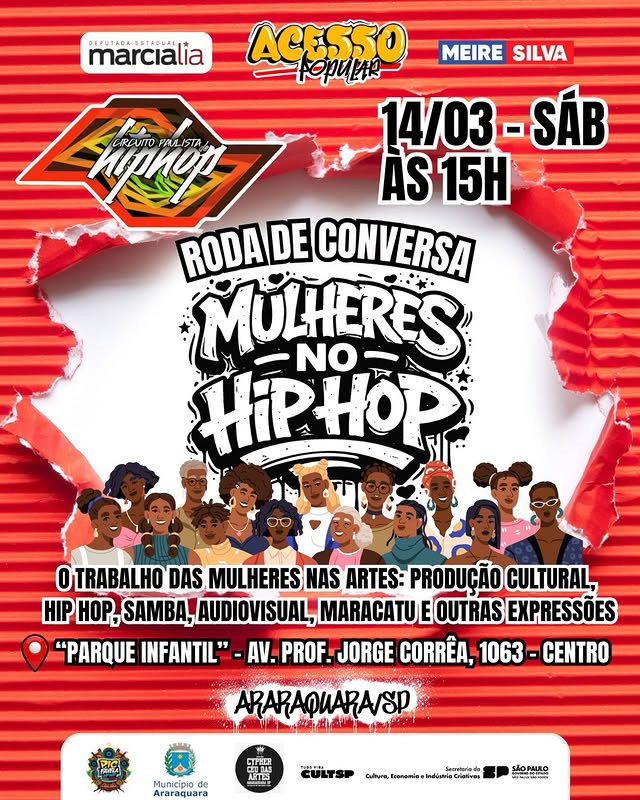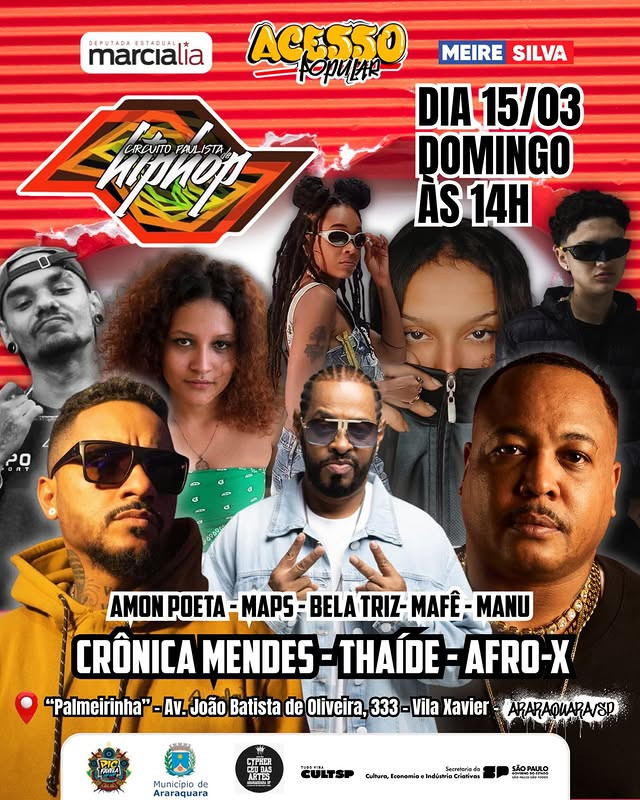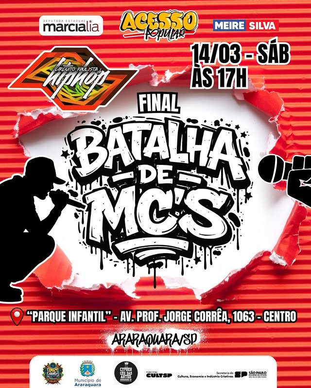 Circuito Paulista de Hip Hop De 12 á 15 de Março 12 Mar - 2026 · 19:00 > 12 Mar - 2026 · 19:00 Araraquara Circuito Paulista de Hip Hop (Foto: Reprodução)