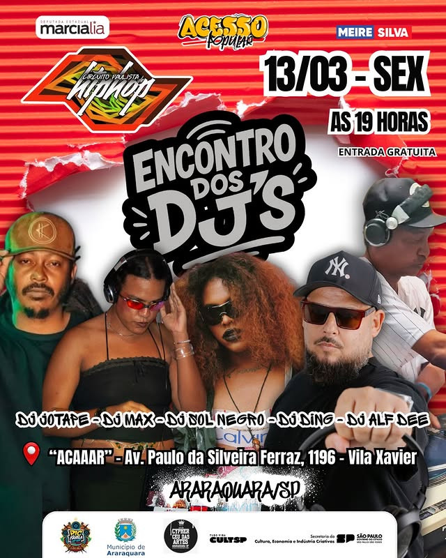 Também na sexta-feira, vai rolar o Encontro de DJs no ACAAAR com line-up de artistas locais como DJ Max, DJ Alf Dee, DJ Sol Negro, além dos Djs Ding de Bauru e DJ Jotapê de Porto Feliz.